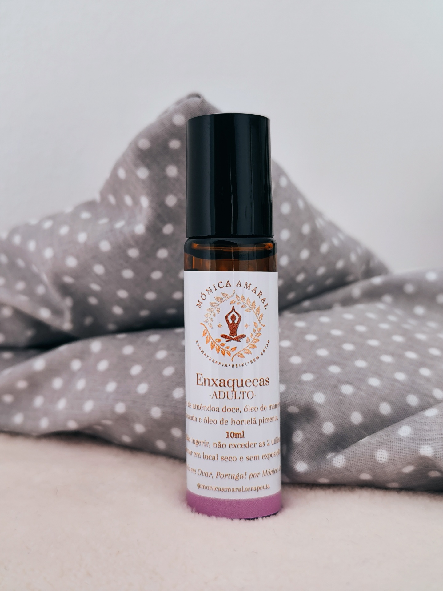 Aplicar o roll on nas fontes da testa, fazer massagem em círculos e colocar a almofadinha à temperatura ambiente de seguida.